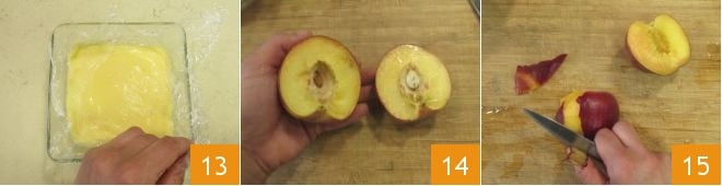 Transfira o creme obtido para um recipiente raso e largo, cubra com filme plástico em contato 13, deixe esfriar e coloque na geladeira para resfriar por pelo menos 30 minutos. Enquanto isso, prepare os pêssegos para o recheio, lave-os e corte-os ao meio, remova o caroço 14 e retire a casca com uma faca pequena 15, depois reserve-os momentaneamente.