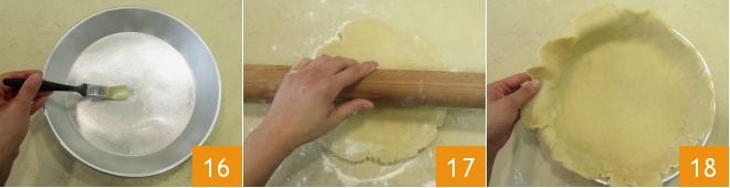 Após o tempo de descanso da massa, unte uma forma de torta com diâmetro de 22 cm na base e diâmetro superior de 26 cm 16. Retire as 2 porções da geladeira e abra-as com um rolo de massa em uma superfície levemente enfarinhada 17 até uma espessura de 4 mm. Forre a base da forma com uma das 2 massas, certificando-se de cobrir bem as bordas também, depois retire o excesso de massa 18.
