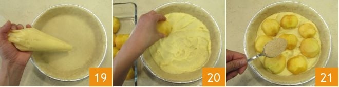 Agora, transfira o creme que já deve estar frio para um saco de confeitar e distribua quase todo ele no fundo da torta até formar uma camada abundante e uniforme 19. Arrume os pêssegos com o lado cortado voltado para baixo 20 e polvilhe com uma colher de açúcar mascavo 21.