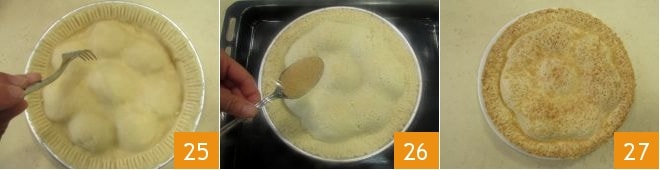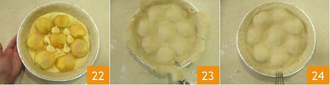 Preencha os espaços restantes com o creme restante, depois coloque a segunda massa sobre a forma e pressione delicadamente com os dedos para aderir tanto nas bordas quanto nos pêssegos, de modo que a forma destes últimos seja visível do lado de fora. Remova o excesso de massa com uma faca pequena 23, depois sele as bordas pressionando com os dedos e finalize com os dentes de um garfo 24.