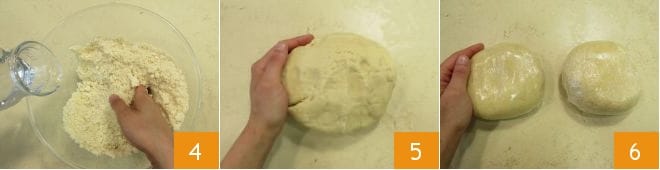 Agora adicione a água fria aos poucos 4 e continue amassando até a mistura ficar bem homogênea, depois transfira para uma superfície de trabalho e forme uma bola 5. Divida a massa ao meio para obter 2 porções de aproximadamente 450 g cada, envolva-as em filme plástico 6 e coloque-as na geladeira para descansar por cerca de uma hora.