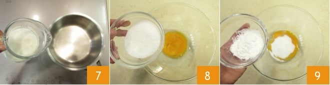 Enquanto a massa descansa, você pode preparar o creme: despeje o leite em uma panela 7 e leve-o quase à fervura; enquanto isso, coloque as gemas em uma tigela à parte, adicione o açúcar 8 e o amido de milho 9 e misture bem para incorporar tudo.
