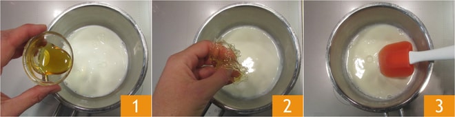 Para preparar a torta de pistache com namelaka de iogurte, comece preparando a namelaka: primeiro coloque a gelatina de molho em água fria e derreta o chocolate branco em banho-maria ou no micro-ondas. Aqueça o leite e o mel em uma panela 1. Assim que atingir o ponto de fervura, desligue o fogo, adicione a gelatina espremida 2 e misture até dissolver completamente 3. Deixe de lado por um momento.