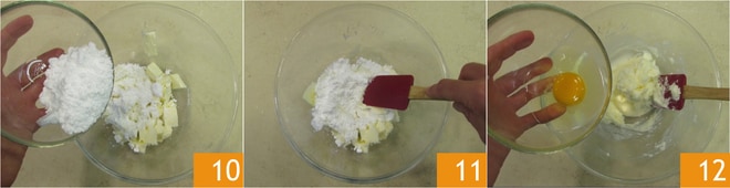 Passe para a massa: coloque a manteiga amolecida e o açúcar de confeiteiro em uma tigela 10 e misture com a espátula 11, em seguida adicione o ovo 12 e misture novamente para absorvê-lo. Não se preocupe se a mistura ficar granulada.