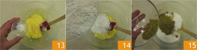Neste ponto, adicione o sal 13, a farinha de trigo 14 e a farinha de pistache 15.