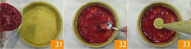 Agora, retire a massa da geladeira e espalhe uma fina camada de geleia de framboesa, previamente peneirada 31 32, e, em seguida, adicione o creme frangipane 33.