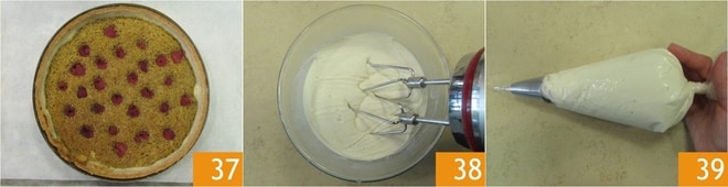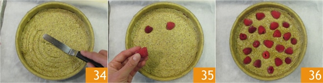 Espalhe uniformemente o creme com uma espátula até alguns milímetros da borda 34, em seguida, encaixe as framboesas pressionando delicadamente 35. Asse em forno ventilado pré-aquecido a 160°C por 30 minutos 36.