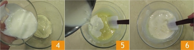 Em outra tigela, misture o iogurte com o chocolate derretido 4, em seguida adicione o leite ainda quente, aos poucos 5, e misture bem com a espátula 6.