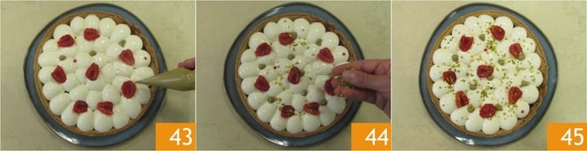 Complete a decoração com pontinhos de creme de pistache 43 e granulado de pistache 44. Sua torta de pistache com namelaka de iogurte está pronta para ser servida 45!