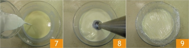 Por fim, adicione o creme de leite frio em fio 7 e emulsione com um mixer de imersão 8. Cubra com filme plástico em contato e deixe firmar na geladeira por pelo menos 8 horas 9.