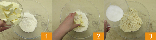 Para preparar a torta de ricota e mirtilos, comece pela preparação da massa. Coloque em uma tigela a manteiga fria com a farinha 1, belisque-a rapidamente com os dedos 2, para não aquecê-la muito. Você deve obter uma mistura arenosa. Neste ponto, adicione o açúcar 3 e trabalhe por poucos instantes.