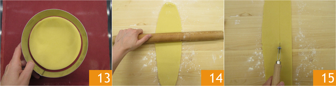 Coloque também a forma 13. Com a massa restante, crie a borda: estenda 14 e corte uma tira larga de 4 cm e do comprimento do anel (cerca de 60 cm) 15.