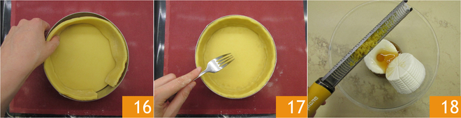 Coloque a tira de massa aderindo bem ao anel 16, para que durante o cozimento não faça dobras. Fure a base da massa com um garfo 17 e deixe esfriar na geladeira por pelo menos 30 minutos. Prepare o recheio: em uma tigela, misture a ricota, o mel e a casca de limão 18.