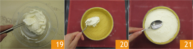 Reserve o creme 19. Passado o tempo necessário, recheie com o creme de ricota 20 e nivele com o dorso de uma colher 21.