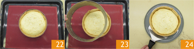 Asse em forno estático pré-aquecido a 180° por cerca de 45 minutos. Uma vez fora do forno, deixe esfriar, retire o anel 23 e transfira para o prato de servir 24.