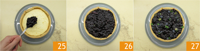 Despeje a compota rápida de mirtilos 25 26 e decore com mais mirtilos frescos e folhas de orégano fresco. A torta de ricota e mirtilos está pronta para ser servida 27.