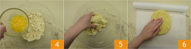Adicione o ovo 4 e amasse por pouco tempo 5, para compactar tudo. Forme um bloco e coloque entre duas folhas de papel manteiga, pressionando levemente 6.