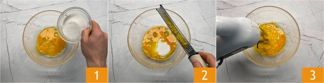 Para preparar a torta de ricota fofíssima, comece quebrando os ovos em uma tigela, depois adicione o açúcar 1 e as raspas de limão 2. Bata com uma batedeira por cerca de dez minutos 3.
