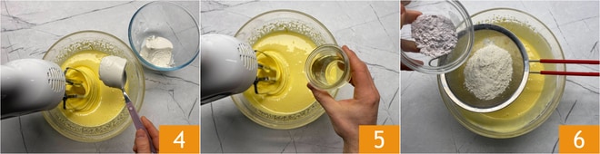 Quando a mistura tiver dobrado de volume, adicione a ricota em colheradas 4, depois diminua um pouco a velocidade e incorpore o óleo em fio 5. Desligue a batedeira e peneire a farinha e o fermento na tigela 6.