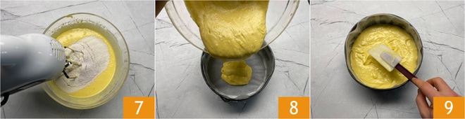 Bata novamente em velocidade muito baixa apenas o tempo necessário para incorporar tudo 7. Transfira a mistura para uma forma de 21-22 cm untada e forrada com papel manteiga 8, depois nivele bem a superfície 9.