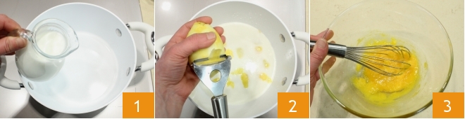 Para preparar a torta de ruibarbo com creme de confeiteiro de limão, comece preparando o Creme de limão. Despeje o leite e o creme de leite em uma panela 1 e aromatize com casca de limão, tomando cuidado para não usar a parte branca amarga 2. Em uma tigela à parte, bata as gemas e o açúcar com um batedor 3.