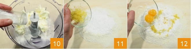 Enquanto isso, prepare a Massa podre começando pelo sablage: coloque a manteiga fria da geladeira cortada em cubos em um processador com lâminas junto com a farinha 10. Ligue o processador até obter uma mistura arenosa, depois transfira para uma bancada; faça a clássica forma de fonte e adicione o açúcar de confeiteiro, a casca de limão ralada 11 e as gemas 12.