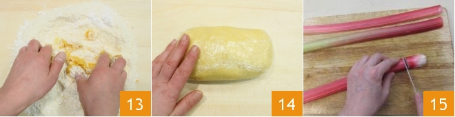 Trabalhe a massa primeiro com um garfo, depois com as mãos 13; amasse brevemente, apenas o suficiente para compactar a massa para que a massa não aqueça demais com o calor das mãos e permaneça quebradiça. Forme um disco e achate antes de envolvê-lo em filme plástico 14; coloque na geladeira para firmar por pelo menos 30 minutos. Enquanto isso, dedique-se à limpeza do ruibarbo lavando-o, secando-o e removendo as extremidades 15.