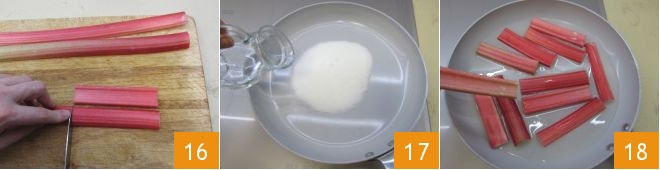 Corte o ruibarbo em tiras de 10,5 cm 16. Em uma frigideira, despeje o açúcar e a água e acenda o fogo 17. Derreta o açúcar e coloque os pedaços de ruibarbo, cozinhando-os por cerca de 2 minutos de cada lado 18.