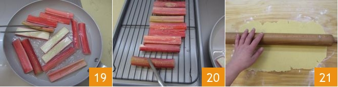 Vire o ruibarbo com a ajuda de uma pinça de cozinha e continue cozinhando 19. Coloque-o em uma gradinha para escorrer o excesso de calda e para esfriar 20. Após o tempo necessário, pegue a massa e com a ajuda de um rolo abra-a sobre uma bancada ligeiramente enfarinhada 21.