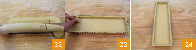 Unte e polvilhe uma forma de torta do tamanho de 35x11 cm com farinha, em seguida, coloque a massa com a ajuda do rolo 22. Remova o excesso das bordas cortando com uma faca pequena e faça a massa aderir bem à forma pressionando com uma bolinha de massa envolta em um pedaço de filme plástico (23-24).