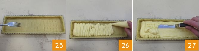 Fure a base da torta com os dentes de um garfo 25, depois transfira o creme de confeiteiro já frio para um saco de confeitar sem bico ao qual você pode fazer um furo e distribua sobre a base 26, nivelando bem com uma espátula 27.