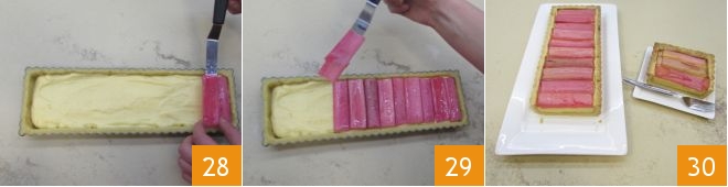Uma vez terminado, decore a torta com o ruibarbo cortado em tiras, posicionando-as cuidadosamente sobre o creme uma ao lado da outra (28-29); asse em forno estático a 180° por 30 minutos (ou a 160° por 20 minutos em forno ventilado). Uma vez pronto, deixe esfriar, finalmente você poderá saborear sua torta de ruibarbo com creme de confeiteiro de limão 30!