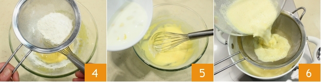 Adicione o amido de milho peneirado 4, em seguida o leite quente em fio 5 e misture energicamente para obter uma mistura homogênea e fluida. Despeje novamente a mistura na panela, coando com uma peneira 6.