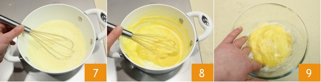 Coloque novamente a mistura no fogo 7, mexendo até ficar densa 8, depois transfira para uma tigela e cubra com filme plástico em contato para evitar que se forme uma película na superfície 9. Deixe o creme esfriar primeiro à temperatura ambiente e depois na geladeira.