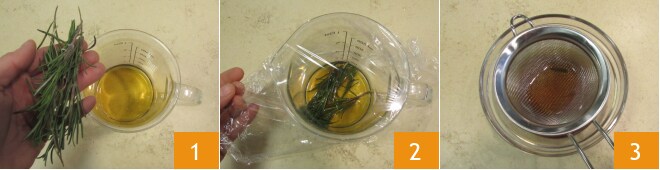 Para preparar o bolo de rum e alecrim, primeiro despeje o rum em uma jarra e adicione os ramos de alecrim 1. Cubra com filme plástico e deixe macerar à temperatura ambiente por pelo menos uma noite 2. Após esse tempo, filtre o rum para remover o alecrim 3.