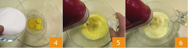 Coloque os ovos e o açúcar em uma tigela grande 4, comece a bater com a batedeira e adicione o sal 5. Quando a mistura estiver clara e espumosa, despeje o óleo de sementes em fio 6.