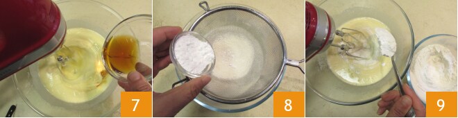 Em seguida, adicione também o rum aromatizado 7. Em uma tigela separada, peneire a farinha com o fermento 8. Adicione à mistura uma colher das pós de cada vez enquanto continua batendo com a batedeira 9.