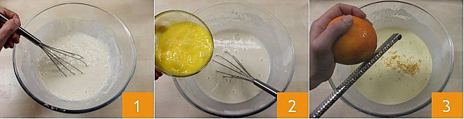 Para preparar a torta de crepes doces, comece preparando as crepes que serão a estrutura da sua sobremesa: coloque em uma tigela de bordas altas a farinha previamente peneirada, o açúcar refinado, as sementes de meia fava de baunilha ou um pacote de vanilina, uma pitada de sal e o leite. Trabalhe a mistura com um batedor manual ou uma batedeira elétrica até que fique lisa, aveludada e sem grumos 1. Em uma tigela separada, bata os ovos com um garfo, depois adicione-os aos outros ingredientes 2 e continue misturando. Derreta a manteiga em uma panela em fogo baixo e deixe esfriar, depois adicione-a à massa das crepes e misture bem. Por fim, adicione à massa a casca ralada da laranja 3.