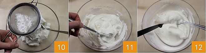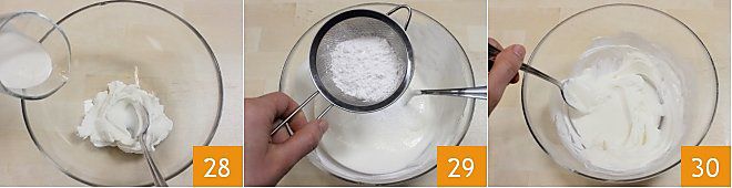 Quando terminar as camadas, passe a preparar o creme para a decoração: em uma tigela, coloque 100 g de iogurte grego e dilua com o creme de leite fresco líquido 28; adicione então o açúcar de confeiteiro peneirado e misture com uma colher até obter um creme fluido 30.