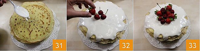 Com uma colher, despeje aos poucos o creme obtido no topo da torta a partir do centro 31. Agora você pode decorar a torta colocando cerejas e morangos inteiros no topo 32 e adicionar folhas de hortelã para dar um toque cênico à sua torta de crepes doces 33.