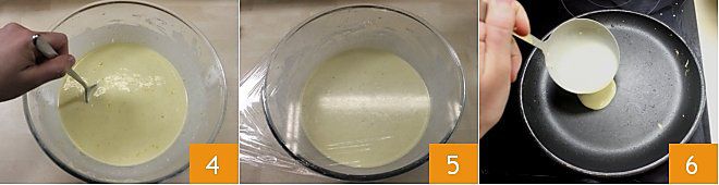 Misture bem os ingredientes para obter uma massa densa sem grumos 4. Cubra a massa com filme plástico e deixe descansar na geladeira por pelo menos meia hora 5. Após o tempo de descanso necessário, retire a massa da geladeira e comece a fazer suas crepes: aqueça uma frigideira para crepes ou uma frigideira antiaderente de 20 cm de diâmetro. Derreta uma pequena noz de manteiga e espalhe-a por toda a superfície da frigideira com a ajuda de papel de cozinha. Em seguida, despeje uma concha de massa no centro da frigideira 6.