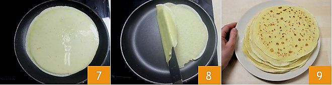 Com a ajuda da concha ou de uma colher, espalhe rapidamente e cuidadosamente a massa por toda a superfície da frigideira 7. Deixe cozinhar por um minuto, levantando as bordas da crepe de vez em quando com uma espátula de crepe ou uma espátula de madeira para soltá-la da superfície; assim que estiver dourada, vire do outro lado e espere que assuma a mesma cor 8. Assim que estiver pronta, retire-a da frigideira deslizando-a sobre um prato, e continue da mesma forma com as outras crepes, colocando-as uma sobre a outra à medida que estiverem prontas 9. Cubra-as com papel de cozinha e reserve-as.
