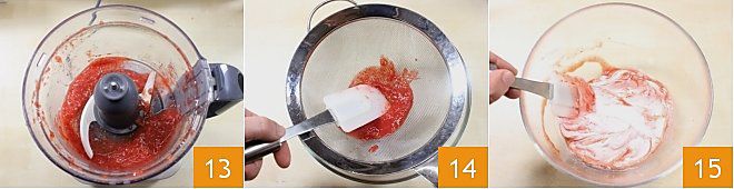 Para o creme de morango: proceda como para o creme de iogurte, coloque 500 g de iogurte grego em uma tigela e adicione o açúcar de confeiteiro peneirado, misturando os ingredientes. Neste ponto, lave os morangos, retire o cabinho verde com uma faquinha e bata-os no liquidificador 13 até obter uma polpa fina que será coada com uma peneira fina 14. Agora adicione a polpa coada ao iogurte grego e misture bem com uma espátula ou colher 15.
