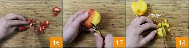Agora passe a preparar as frutas para o recheio: lave os morangos, retire o cabinho e corte-os em cubinhos 16. Descasque os pêssegos com uma faquinha 17, corte-os ao meio para retirar o caroço e depois corte-os em cubinhos 18. Faça o mesmo procedimento também com os damascos.