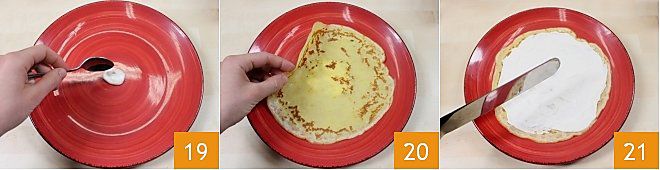 Agora você pode começar a montar sua torta: pegue um prato de servir e espalhe um pouco de creme de iogurte no fundo do prato para que a crepe que serve de base não deslize 19. Coloque a primeira crepe 20 e espalhe cerca de duas colheres de sopa de creme de iogurte branco 21.