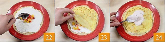 Adicione uma colher de cubinhos de frutas 22 e distribua-os por toda a superfície, depois cubra a camada com outra crepe 23. Em seguida, espalhe esta crepe com cerca de 2 colheres de sopa de creme de morango 24 e distribua os cubinhos de frutas como na camada anterior.