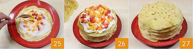 Então continue da mesma maneira (25-26), alternando os cremes de iogurte e morango até terminar a montagem da torta com a última camada de crepe 27.