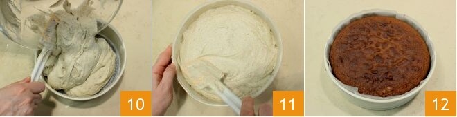 Unte e forre com papel manteiga uma forma de 24 cm de diâmetro e despeje a massa 10, nivelando bem com a espátula 11. Asse em forno estático pré-aquecido a 180°C por 60 minutos (ou em forno ventilado a 160°C por 50 minutos): se após 30-40 minutos a superfície da torta dourar demais, cubra-a com folha de alumínio e continue assando. Verifique o cozimento inserindo um palito no centro que, ao ser retirado, deve sair seco e limpo; caso contrário, asse por mais alguns minutos. Uma vez pronta 12, retire a torta do forno e da forma, deixando esfriar completamente sobre uma grade.