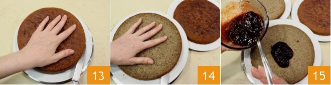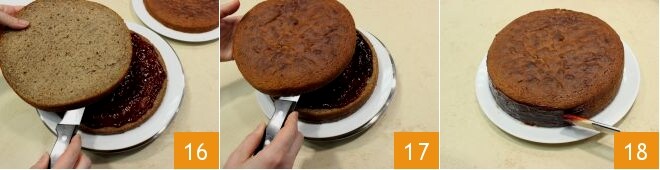 Cubra com o segundo disco 16 e recheie novamente, então finalize a torta colocando o último disco 17. Neste ponto, você pode proceder com as decorações: pincele as bordas da torta com a geleia que você reservou 18