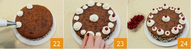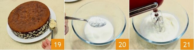 e adira às bordas da torta as amêndoas em lâminas 19. Você pode decidir decorar a torta com chantilly: bata o creme de leite fresco com açúcar de confeiteiro usando uma batedeira elétrica (20-21).